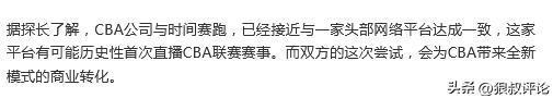 根据媒体人“球圈赵探长”发文:CBA公司与时间赛跑,已经接近与一家头部网络平台达成一致,这家平台有可能历史性首次直播CBA联赛赛事。