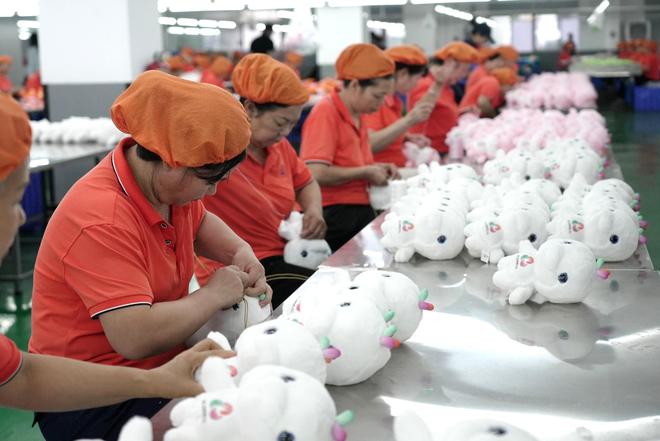 在康达玩具生产车间,数百名工人正加紧赶制吉祥物公仔。